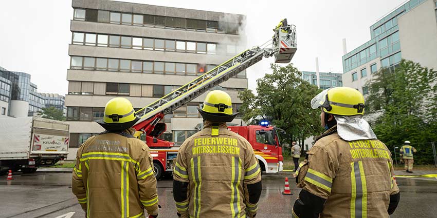 Zu den größten Übungsszenarien an diesem Wochenende zählte ein Brand in einem mehrstöckigen Hochhaus in Planegg. Das Hauptaugenmerk lag hier vor allem auf der Suche und Rettung der zahlreichen Bewohner eines Hochhauses in der Fraunhoferstraße. Die Feuerwehrleute arbeiteten eng mit dem Rettungsdienst zusammen, um die Betroffenen aus den Stockwerken zu evakuieren sowie Schwerstverletzte möglichst schnell einer klinischen Versorgung zuzuführen. Dazu wurde eine Vielzahl von Trupps unter schwerem Atemschutz eingesetzt. Die Herausforderung lag darin, die Menschen in den Wohnungen, Fluren und Treppenhäusern zu finden, in Sicherheit zu bringen und die Brände zu bekämpfen. Hierbei kamen neben sechs Hilfeleistungslöschfahrzeugen auch zwei Drehleitern zum Einsatz.