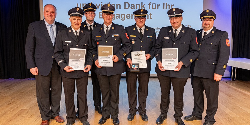 Erhielten Sonderehrungen für ihr langjähriges Engagement (v. l. n. r.): Kreisbrandmeister Eric Bayer (Bayerisches Feuerwehr-Ehrenkreuz in Silber), Kreisbrandinspektor Andreas Englberger (Bayerisches Feuerwehr-Ehrenkreuz in Gold), Dr. Markus Hardi (Feuerwehr-Ehrenkreuz in Silber) und Kreisbrandmeister Andreas Mur (Bayerisches Feuerwehr-Ehrenkreuz in Silber); zusammen mit Landrat Christoph Göbel, Kreisbrandrat Harald Stoiber und Kreisbrandinspektor Robert Paul.